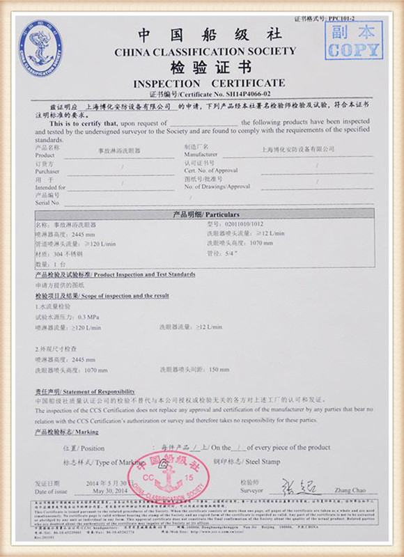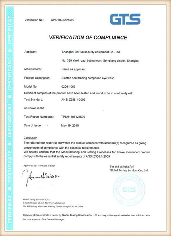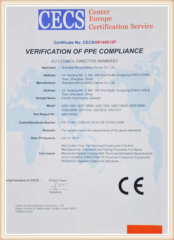The company's products have successively passed: American ANSI z358.1 certification, European CE en15154-1:2006 certification, CCS certification of China Classification Society, obtained 9 patent certificates and a number of appearance design patents; adhere to the "innovation and development" as the driving force of Bohua development, pay attention to the upgrading and research and development of eyewash products, so that the eyewash technology always remains the leading position